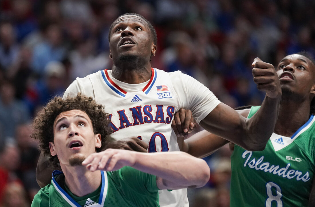 Kansas forward Flory Bidunga (40) pushes his way into position against Texas A&M-Corpus Christi guard Bryson Wheatfall (8) and Texas A&M-Corpus Christi forward Jaden Haire (11) during the second half on Tuesday, Nov. 11, 2025 at Allen Fieldhouse. Photo by Nick Krug
