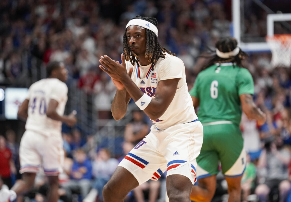 Kansas guard Jayden Dawson (1) is applauded by his teammates as he exits the game in the final minutes on Tuesday, Nov. 11, 2025 at Allen Fieldhouse. Photo by Nick Krug