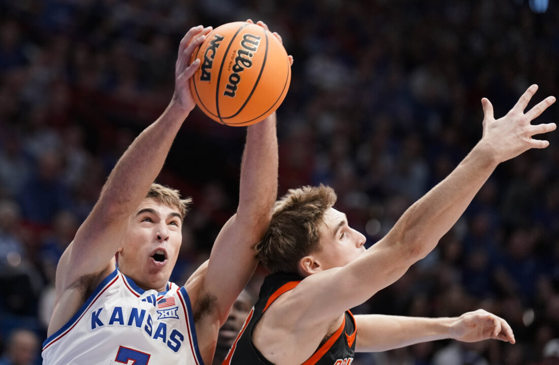 Kansas Jayhawks guard Kohl Rosario (7) pulls a rebound from Princeton Tigers forward CJ Happy (4) during the first half on Saturday, Nov. 15, 2025 at Allen Fieldhouse. Photo by Nick Krug