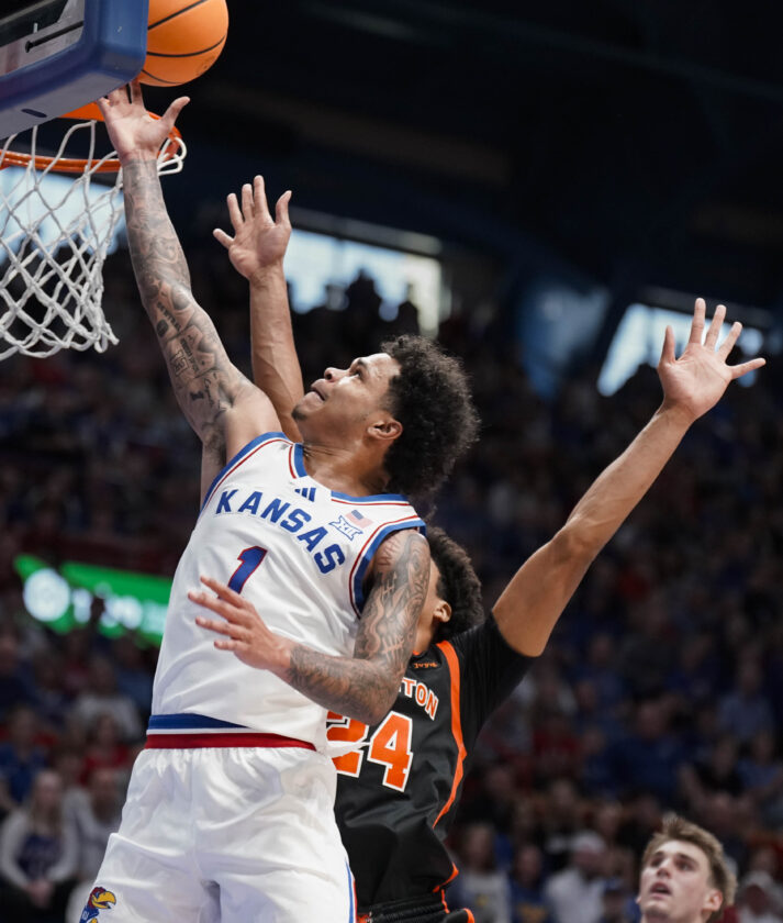 Kansas Jayhawks guard Jayden Dawson (1) lays the ball into the bucket against Princeton Tigers during the first half on Saturday, Nov. 15, 2025 at Allen Fieldhouse. Photo by Nick Krug
