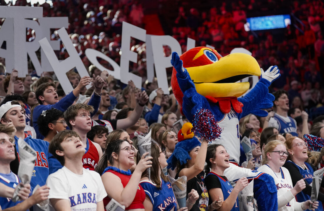 Big Jay and the Kansas student section get wild before tipoff against Princeton on Saturday, Nov. 15, 2025 at Allen Fieldhouse. Photo by Nick Krug