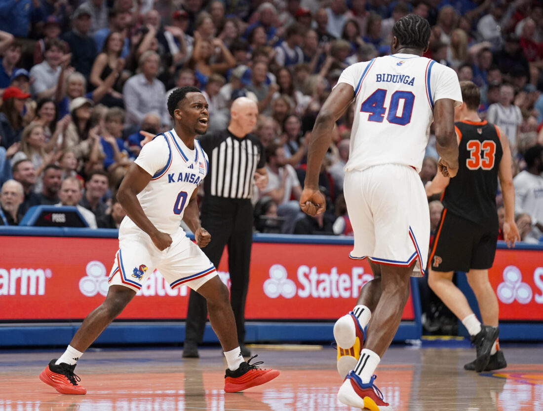 Kansas guard Nginyu Ngala (0) celebrates a dunk from Kansas forward Flory Bidunga (40) during the first half on Saturday, Nov. 15, 2025 at Allen Fieldhouse. Photo by Nick Krug