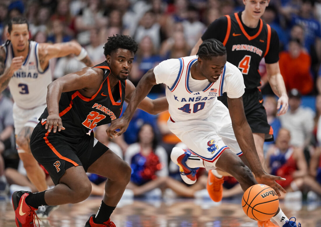 Kansas forward Flory Bidunga (40) comes away with a steal from Princeton guard Dalen Davis (22) during the first half on Saturday, Nov. 15, 2025 at Allen Fieldhouse. Photo by Nick Krug