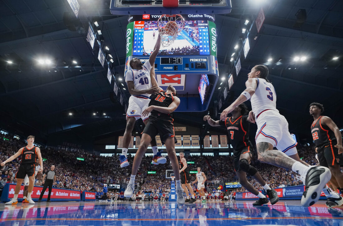 Kansas Jayhawks forward Flory Bidunga (40) delivers a dunk over Princeton Tigers forward Jacob Huggins (12) during the first half on Saturday, Nov. 15, 2025 at Allen Fieldhouse. Photo by Nick Krug
