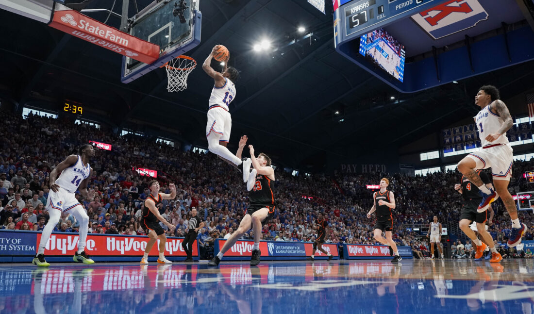 Kansas guard Elmarko Jackson (13) elevates for a lob jam against Princeton during the second half on Saturday, Nov. 15, 2025 at Allen Fieldhouse. Photo by Nick Krug