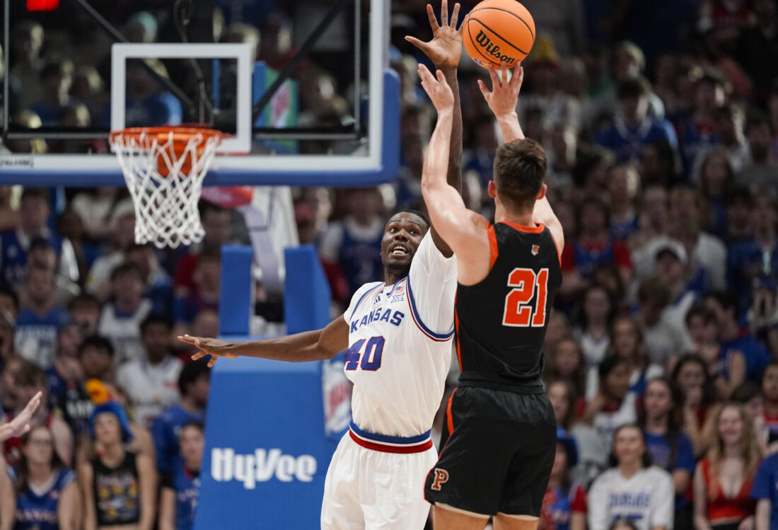 Kansas forward Flory Bidunga (40) comes in to block a shot from Princeton guard Jack Stanton (21) during the second half on Saturday, Nov. 15, 2025 at Allen Fieldhouse. Photo by Nick Krug