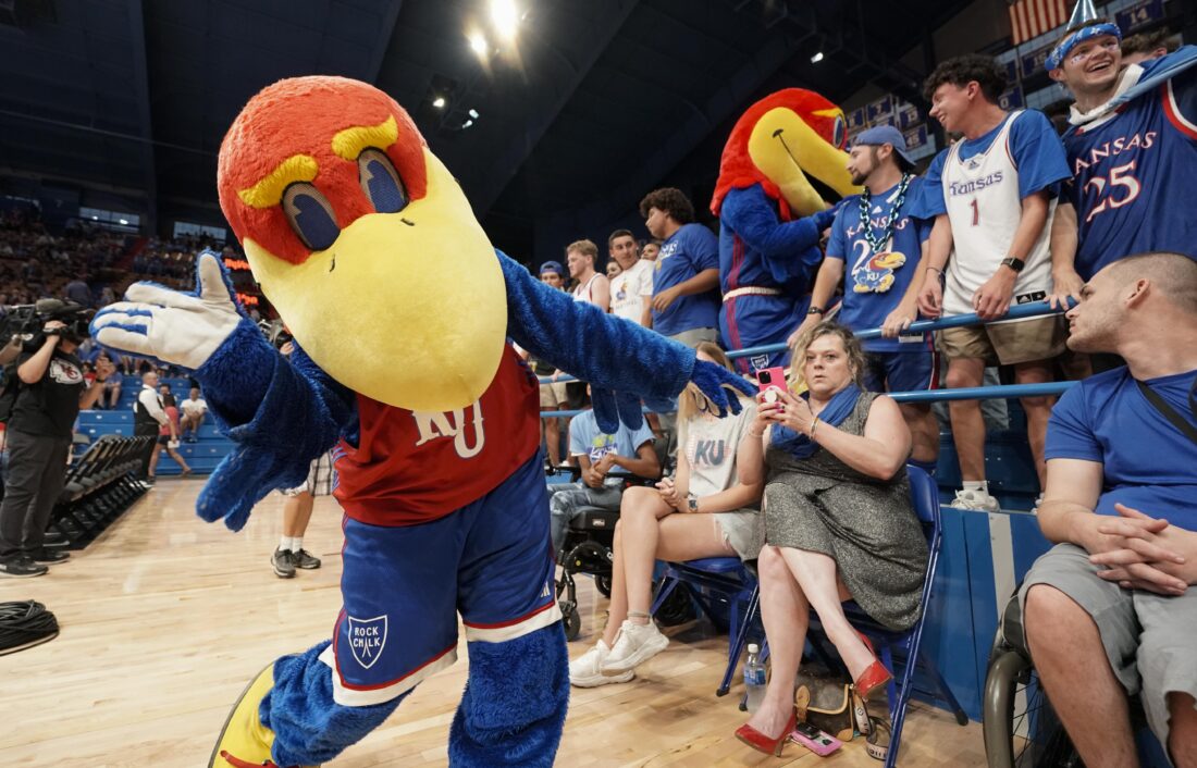 Baby Jay waves to the cameras during Late Night in the Phog on Friday, Oct. 17, 2025 at Allen Fieldhouse. Photo by Nick Krug