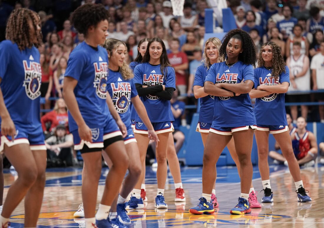 The Kansas women’s basketball team squares off during a dancing routine during Late Night in the Phog on Friday, Oct. 17, 2025 at Allen Fieldhouse. Photo by Nick Krug