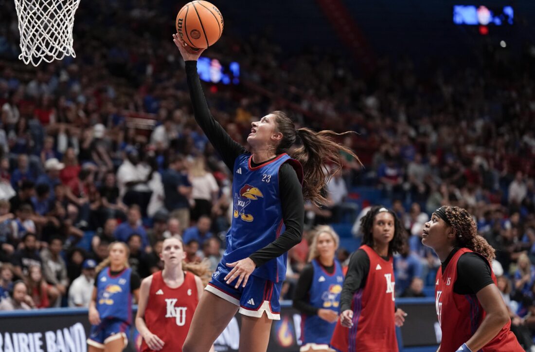 Kansas guard Brittany Harshaw (23) cruises in for a bucket during a Late Night in the Phog scrimmage on Friday, Oct. 17, 2025 at Allen Fieldhouse. Photo by Nick Krug