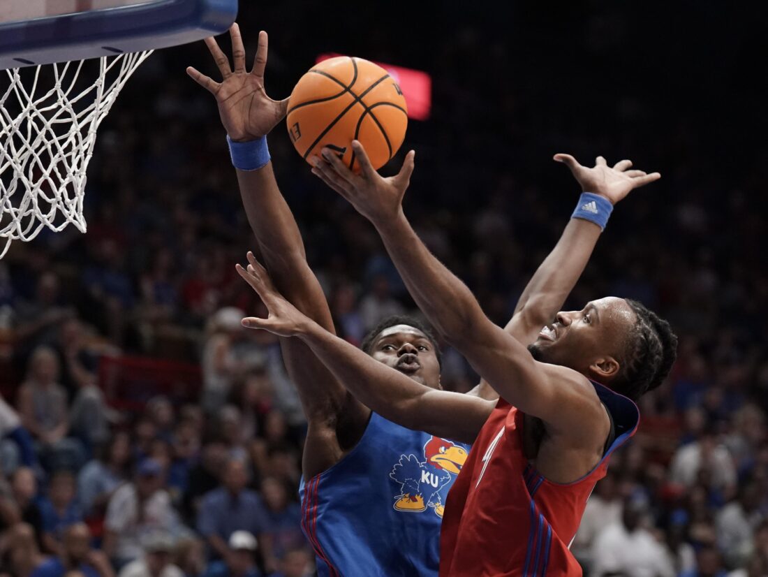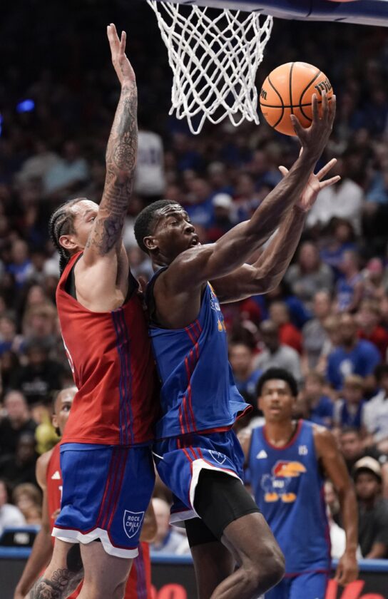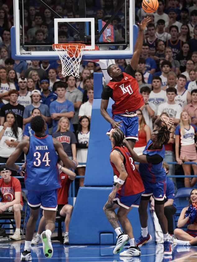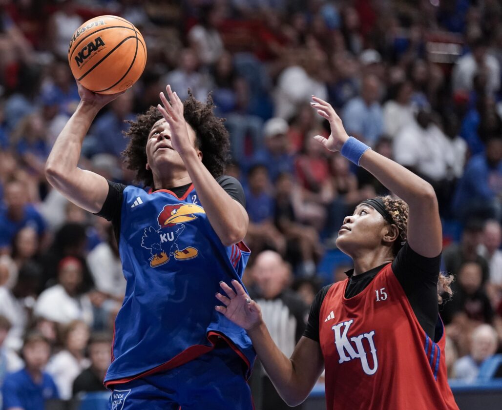 Kansas guard Darryn Peterson (22) floats in for a bucket against Kansas center Paul Mbiya (34) during Late Night in the Phog on Friday, Oct. 17, 2025 at Allen Fieldhouse. Photo by Nick Krug