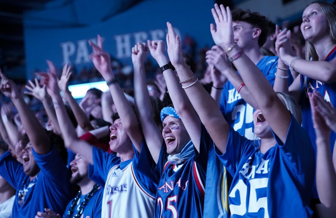 The Kansas student section salutes the men’s players as they are introduced during Late Night in the Phog on Friday, Oct. 17, 2025 at Allen Fieldhouse. Photo by Nick Krug