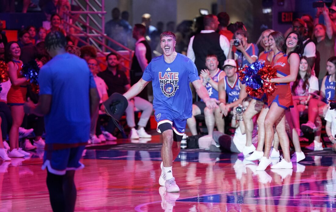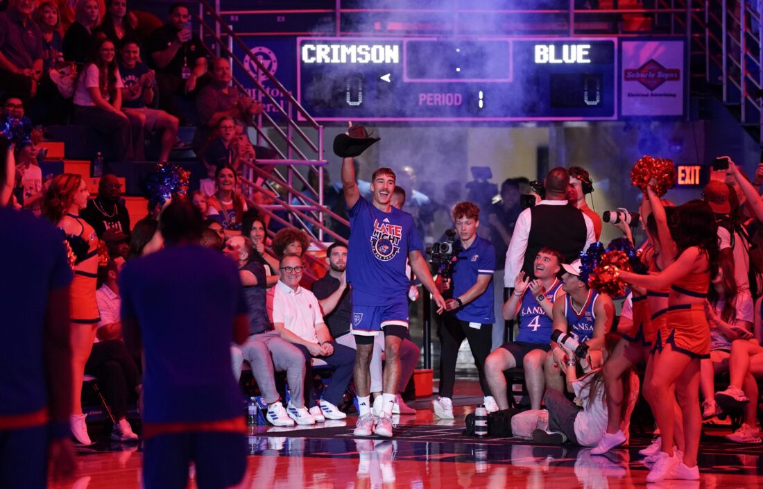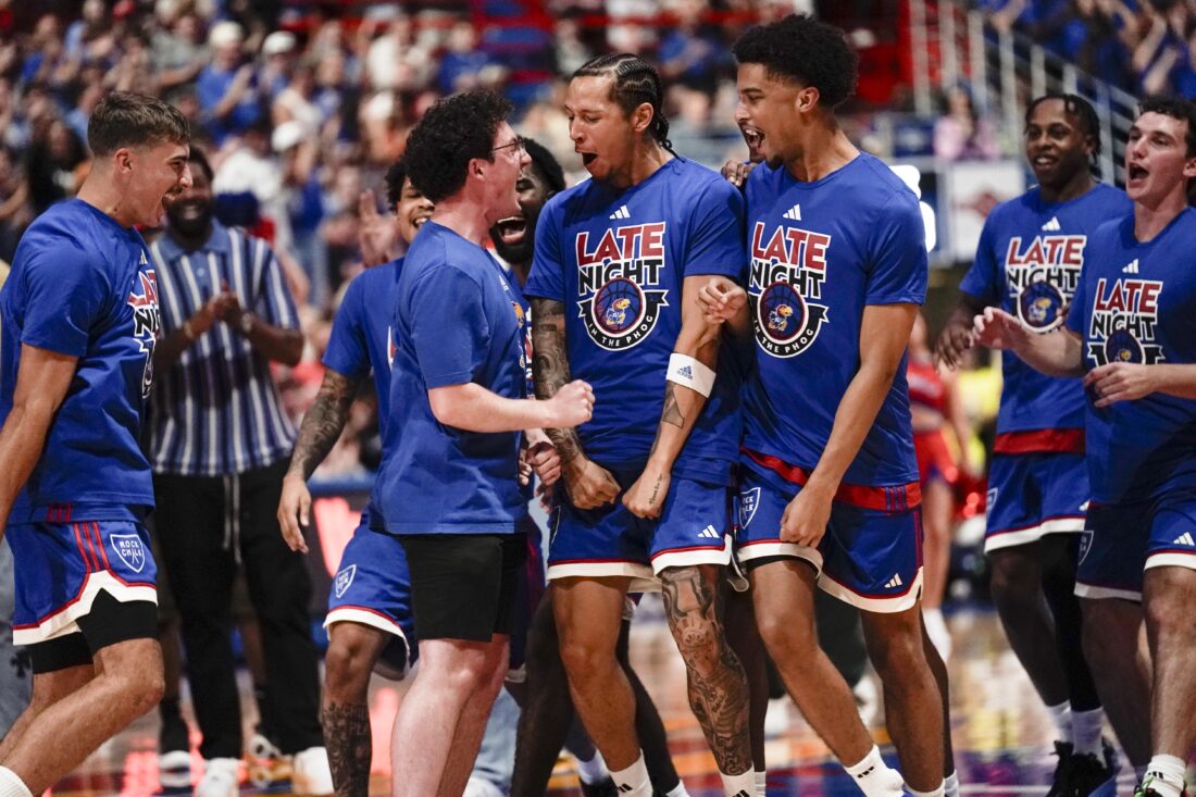 Kansas players chest bump John Riddle, a KU student from Parker, Colorado, after Riddle hit a three-pointer for $7,500 of Bill Self’s money during Late Night in the Phog on Friday, Oct. 17, 2025 at Allen Fieldhouse. Another student, Savannah Parea, also from Parker, Colorado received $7,500 of Self’s money after former guard Zeke Mayo hit a three-pointer. Photo by Nick Krug