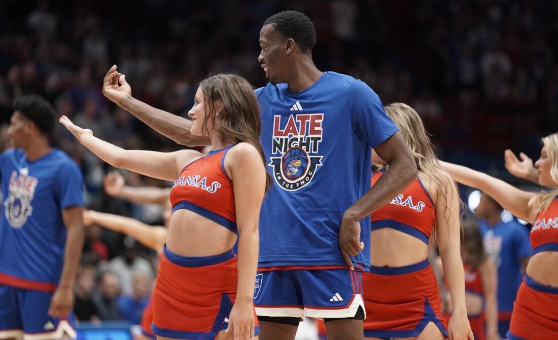Kansas guard Melvin Council Jr. (14) and his teammates dance with members of the Kansas cheer squad during Late Night in the Phog on Friday, Oct. 17, 2025 at Allen Fieldhouse. Photo by Nick Krug