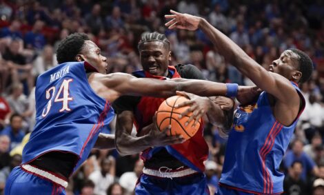 Kansas guard Corbin Allen (2) hooks a pass around Kansas guard Justin Cross (25) during Late Night in the Phog on Friday, Oct. 17, 2025 at Allen Fieldhouse. Photo by Nick Krug