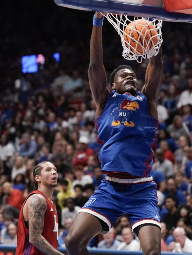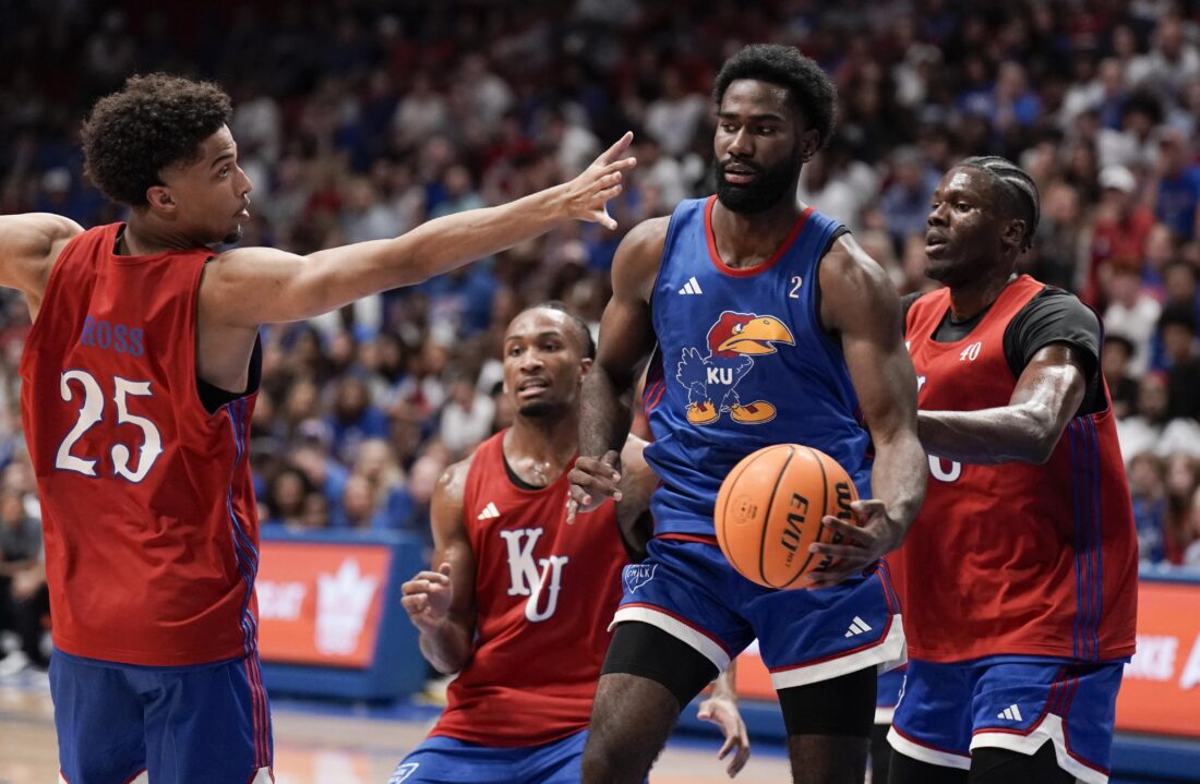 Kansas forward Flory Bidunga (40) gets up to contest a shot from Kansas guard Jamari McDowell (11) during Late Night in the Phog on Friday, Oct. 17, 2025 at Allen Fieldhouse. Photo by Nick Krug