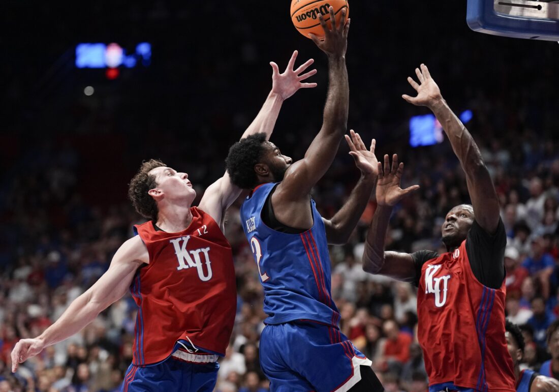 Kansas guard Corbin Allen (2) gets in to the bucket against Kansas guard Wilder Evers (12) and Kansas forward Flory Bidunga (40) during Late Night in the Phog on Friday, Oct. 17, 2025 at Allen Fieldhouse. Photo by Nick Krug