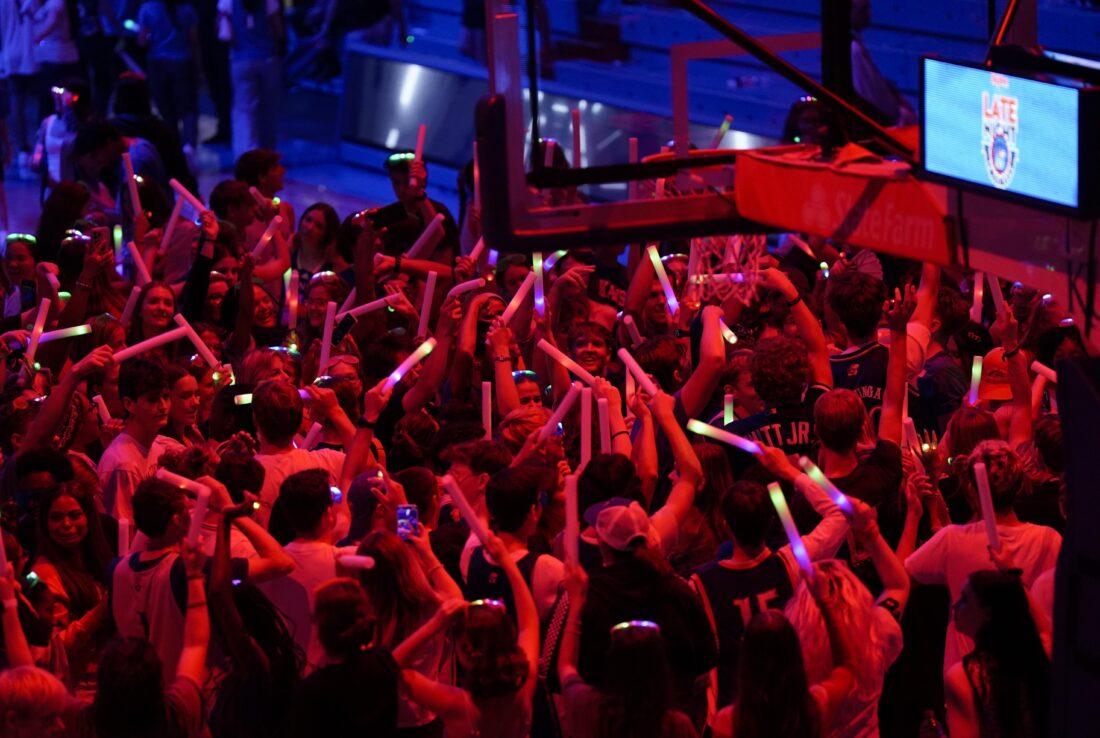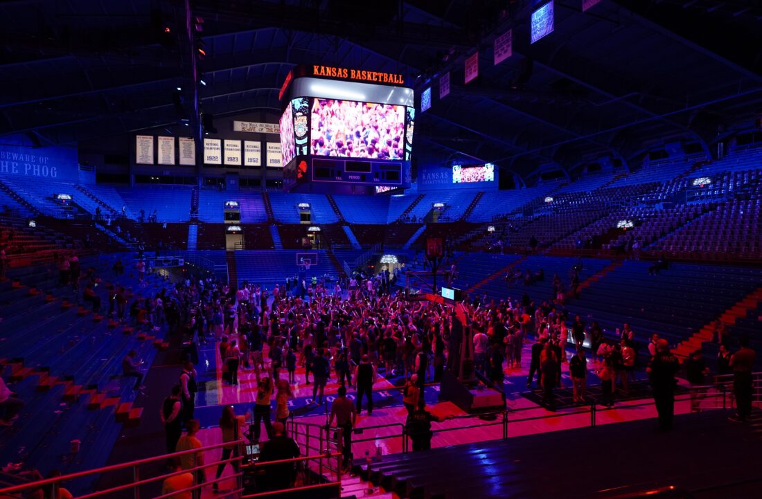 Kansas students fill the court for a dueling DJs party during Late Night in the Phog on Friday, Oct. 17, 2025 at Allen Fieldhouse. Photo by Nick Krug