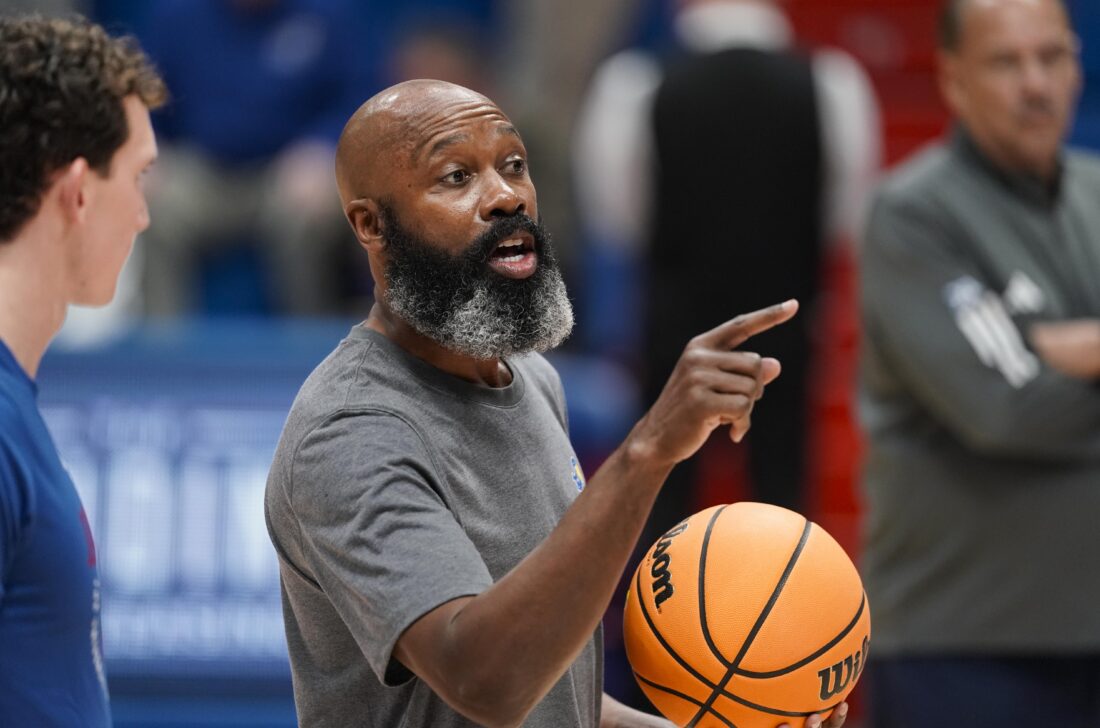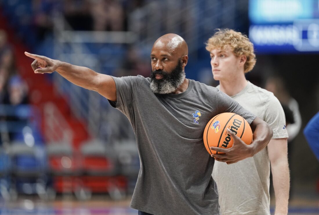 Kansas assistant coach Jacque Vaughn leads the players through warmups prior to tipoff of exhibition game against Fort Hays State on Tuesday, Oct. 28, 2025 at Allen Fieldhouse. Photo by Nick Krug
