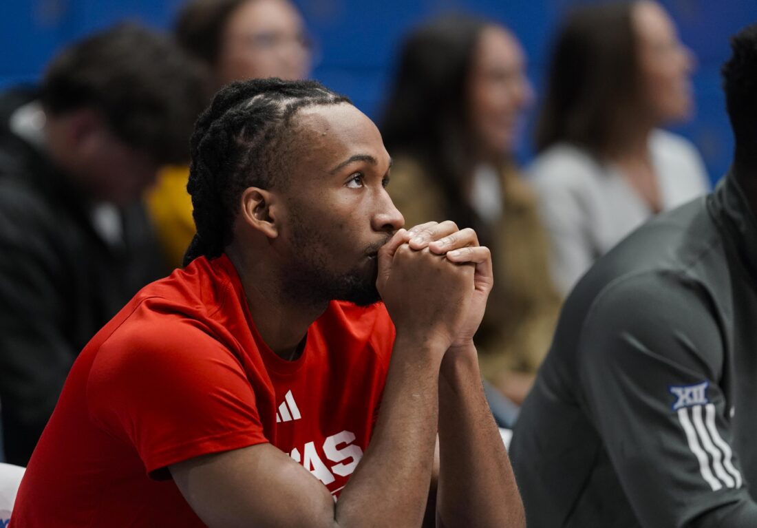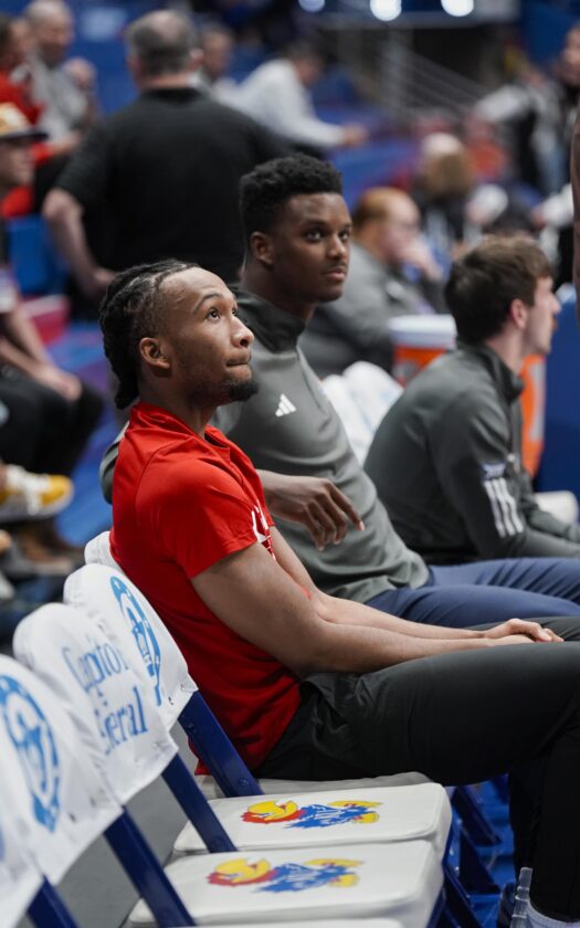 Kansas guard Darryn Peterson (22) sits on the bench in street clothes prior to tipoff against Fort Hays State on Tuesday, Oct. 28, 2025 at Allen Fieldhouse. Photo by Nick Krug