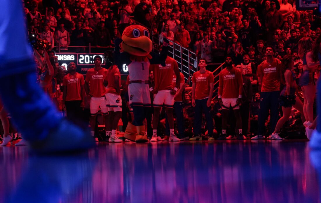 Big Jay and the Jayhawks watch the into video prior to tipoff of an exhibition game on Tuesday, Oct. 28, 2025 at Allen Fieldhouse. Photo by Nick Krug