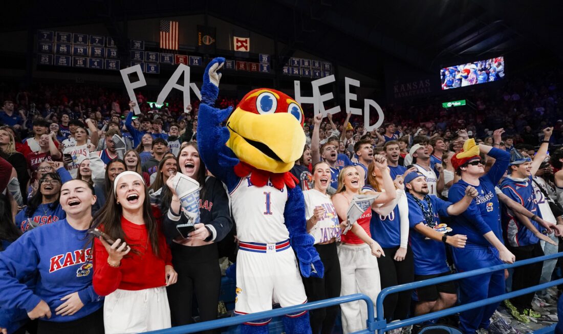 The Kansas student section gets wild with Big Jay during the first half of an exhibition game against Fort Hays State on Tuesday, Oct. 28, 2025 at Allen Fieldhouse. Photo by Nick Krug