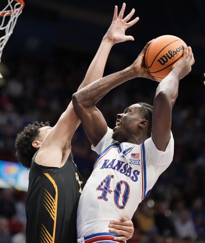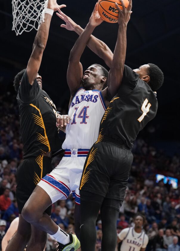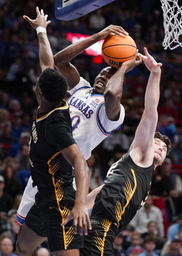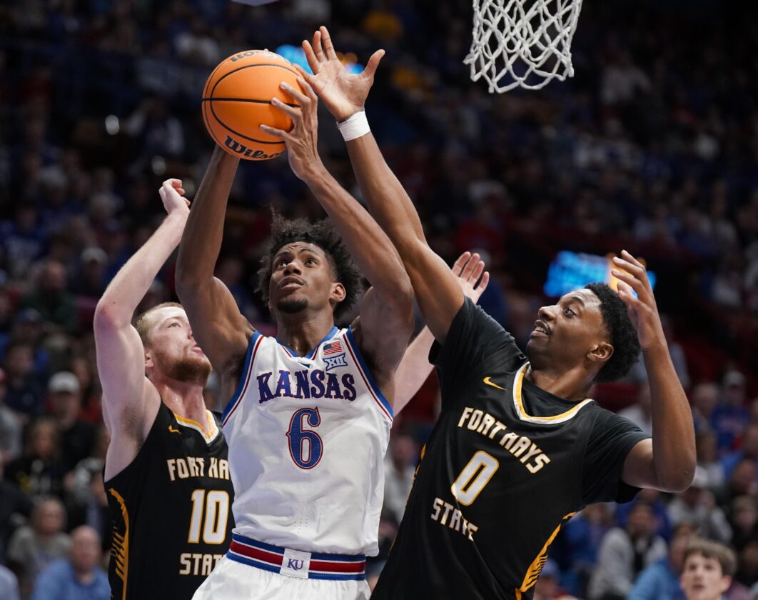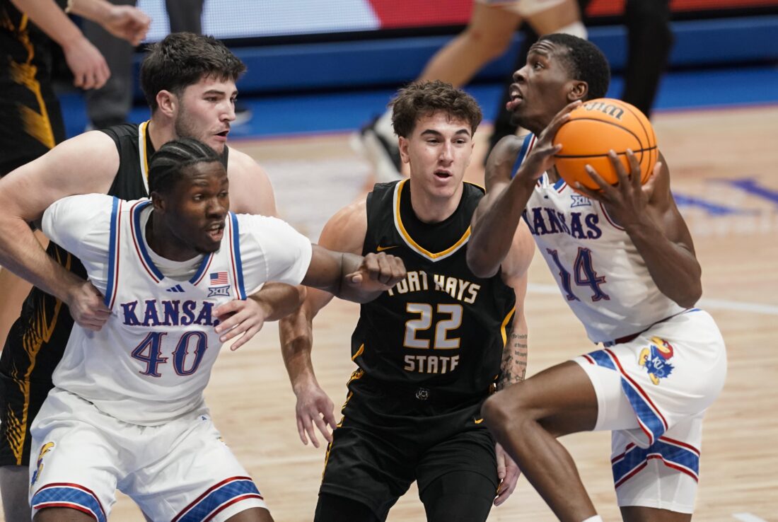 Kansas forward Flory Bidunga (40) tangles under the bucket for a ball with Fort Hays State forward Dan Mukuna (0) and Fort Hays State forward Eli Lawson, right, during the first half of an exhibition game on Tuesday, Oct. 28, 2025 at Allen Fieldhouse. Photo by Nick Krug