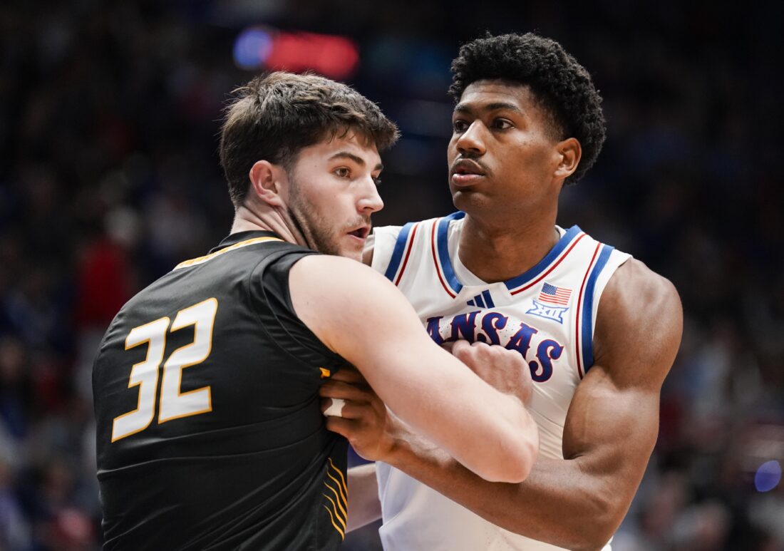 Kansas forward Bryson Tiller positions himself against Fort Hays State forward Eli Lawson (32) during the first half of an exhibition game on Tuesday, Oct. 28, 2025 at Allen Fieldhouse. Photo by Nick Krug