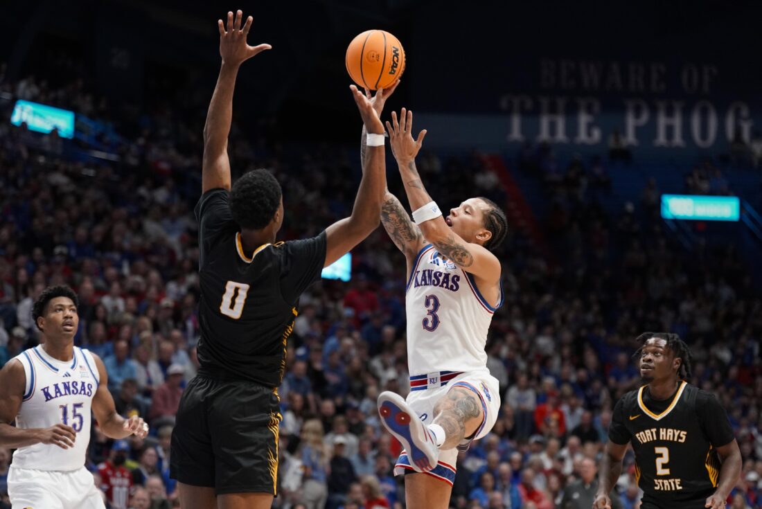 Kansas guard Tre White (3) fades back for a shot against Fort Hays State forward Dan Mukuna (0) during the first half of an exhibition game on Tuesday, Oct. 28, 2025 at Allen Fieldhouse. Photo by Nick Krug