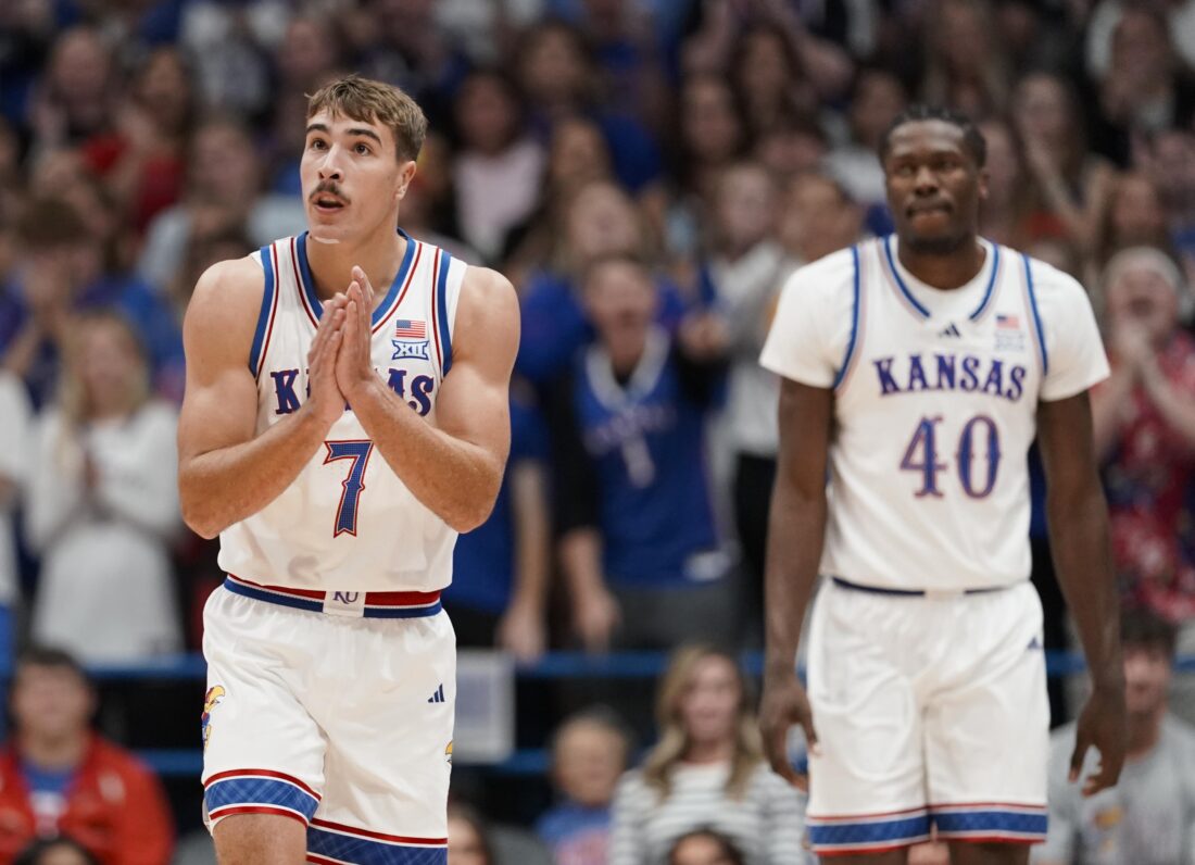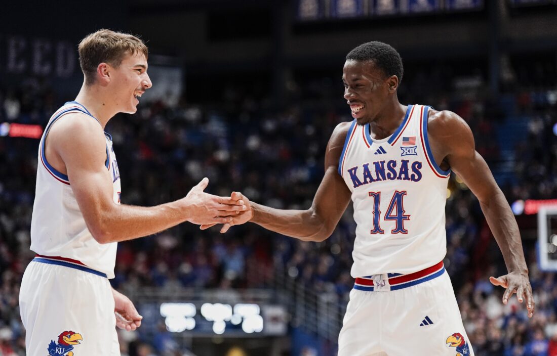 Kansas guard Kohl Rosario, left, and Kansas guard Melvin Council Jr. (14) slap hands after a breakaway dunk by Council during the second half of an exhibition game against Fort Hays State on Tuesday, Oct. 28, 2025 at Allen Fieldhouse. Photo by Nick Krug