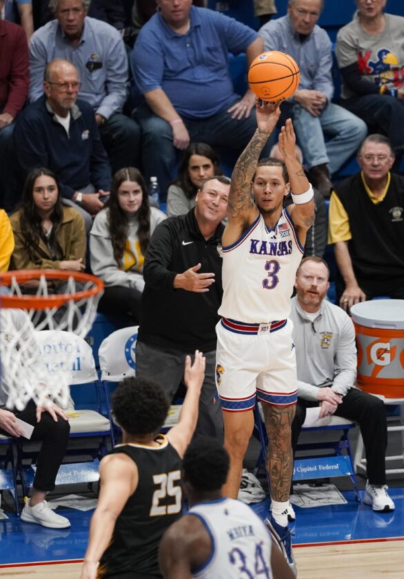 Kansas guard Tre White (3) puts up a three from the wing against Fort Hays State during the first half of an exhibition game on Tuesday, Oct. 28, 2025 at Allen Fieldhouse. Photo by Nick Krug