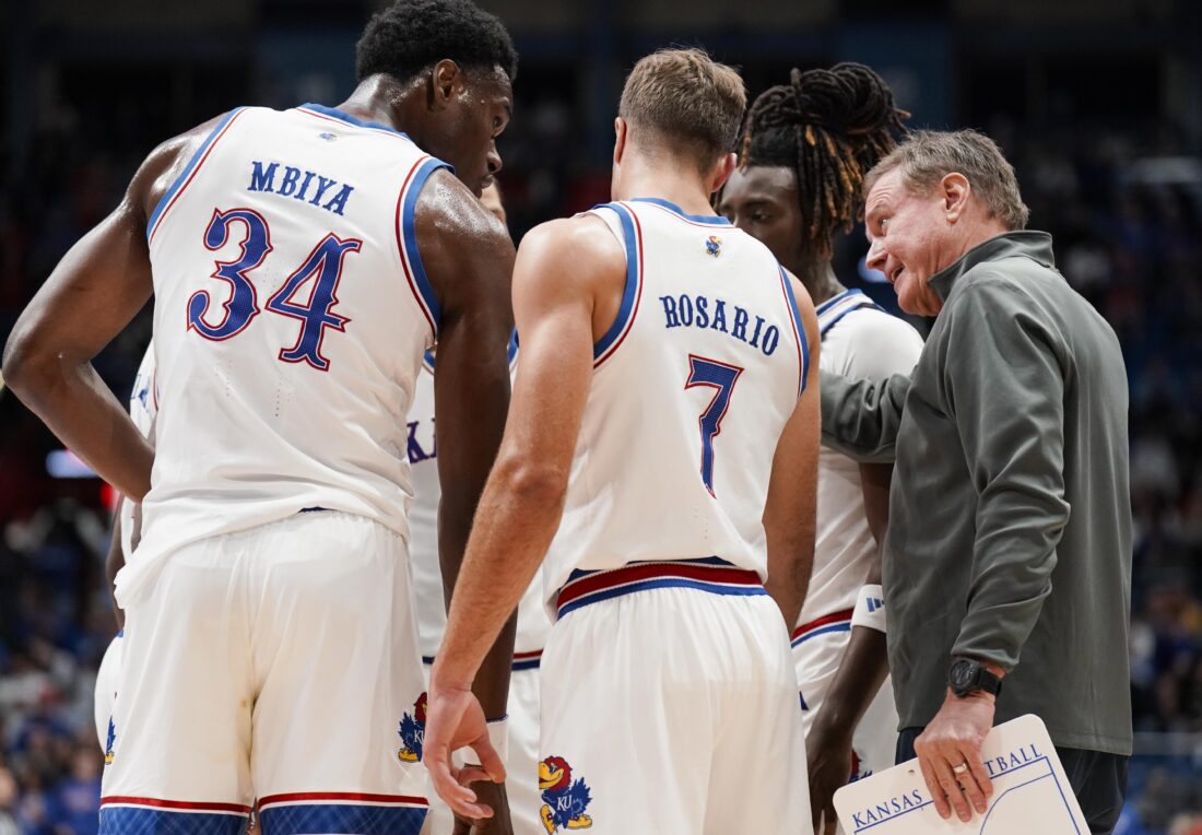 Kansas head coach Bill Self gives some direction in the huddle during the second half of an exhibition game on Tuesday, Oct. 28, 2025 at Allen Fieldhouse. Photo by Nick Krug