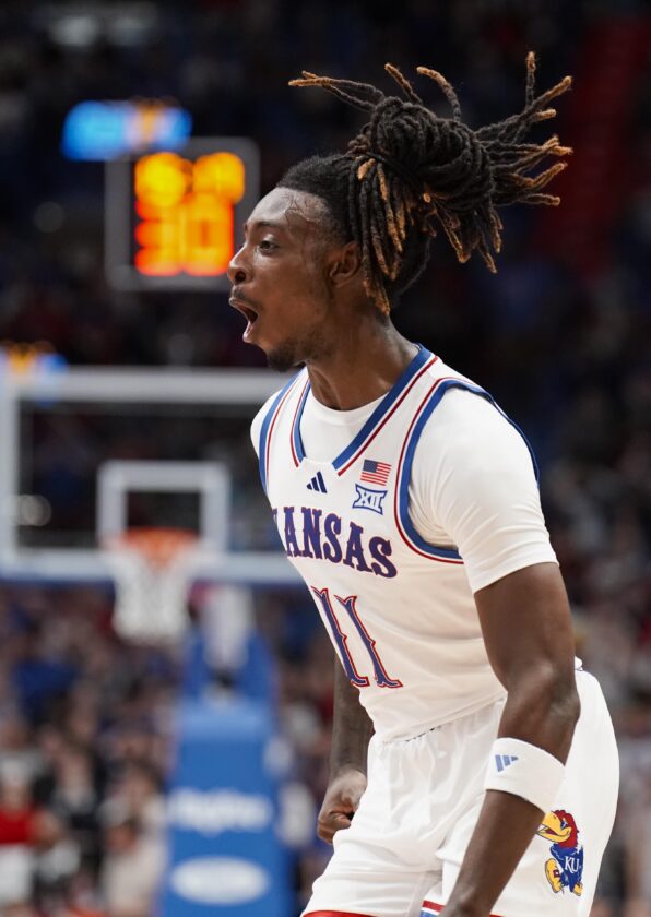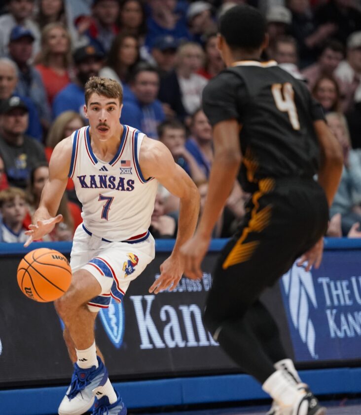 Kansas guard Kohl Rosario (7) celebrates the ball going the Jayhawks’ way after a turnover during the first half of an exhibition game on Tuesday, Oct. 28, 2025 at Allen Fieldhouse. Photo by Nick Krug