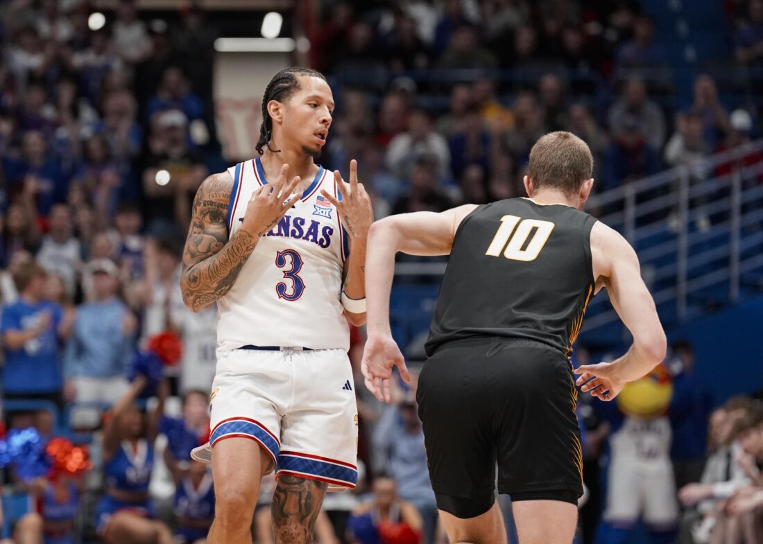 Kansas guard Tre White (3) celebrates after hitting a three against Fort Hays State guard Blake Danitschek (10) during the second half of an exhibition game on Tuesday, Oct. 28, 2025 at Allen Fieldhouse. Photo by Nick Krug