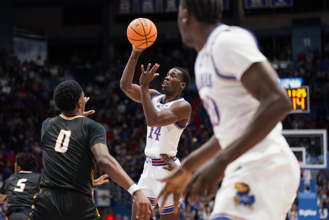 Kansas guard Melvin Council Jr. (14) floats up a lob before Fort Hays State forward Dan Mukuna (0) during the second half of an exhibition game on Tuesday, Oct. 28, 2025 at Allen Fieldhouse. Photo by Nick Krug