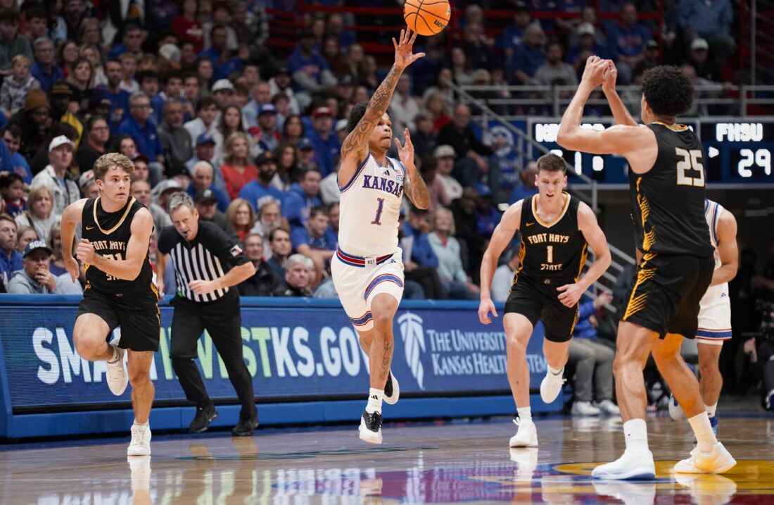 Kansas guard Jayden Dawson (1) pushes the ball up the court after coming away with a steal during the second half of an exhibition against Fort Hays State on Tuesday, Oct. 28, 2025 at Allen Fieldhouse. Photo by Nick Krug
