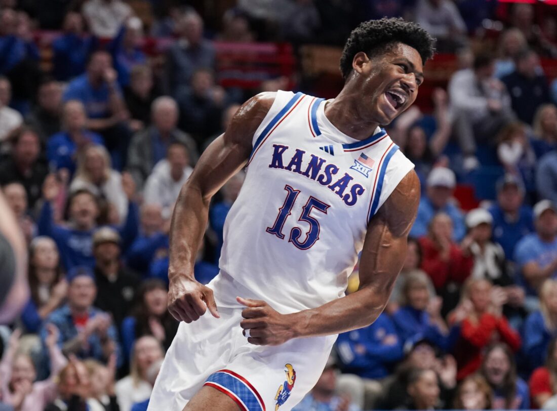 Kansas forward Bryson Tiller (15) celebrates after a dunk during the second half of an exhibition game against Fort Hays State on Tuesday, Oct. 28, 2025 at Allen Fieldhouse. Photo by Nick Krug