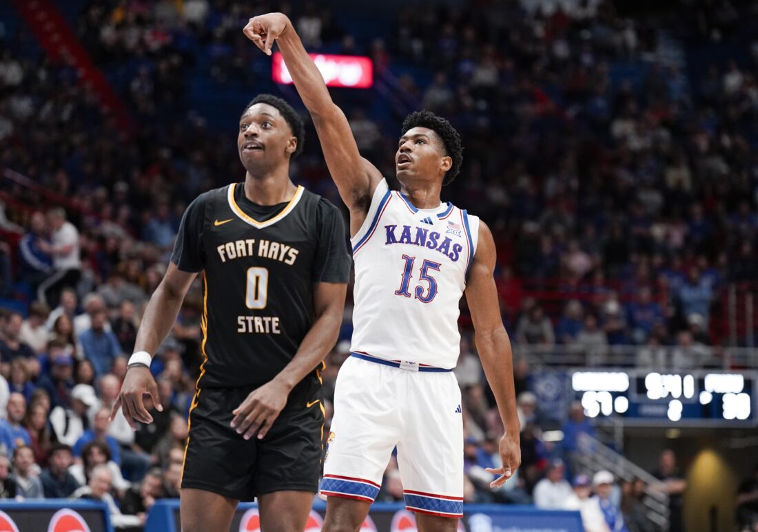 Kansas forward Bryson Tiller (15) watches a three go in over Fort Hays State forward Dan Mukuna (0) during the second half of an exhibition game on Tuesday, Oct. 28, 2025 at Allen Fieldhouse. Photo by Nick Krug