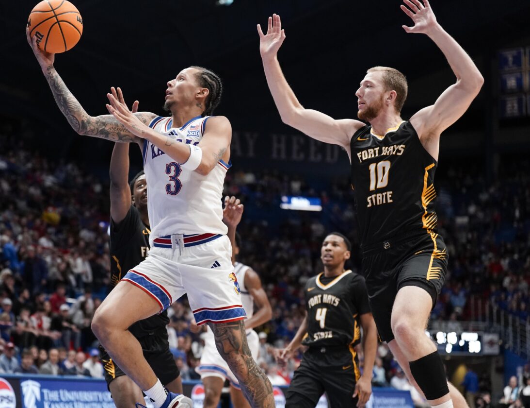 Kansas guard Tre White (3) gets past Fort Hays State guard Blake Danitschek (10) for a bucket during the second half of an exhibition game on Tuesday, Oct. 28, 2025 at Allen Fieldhouse. Photo by Nick Krug