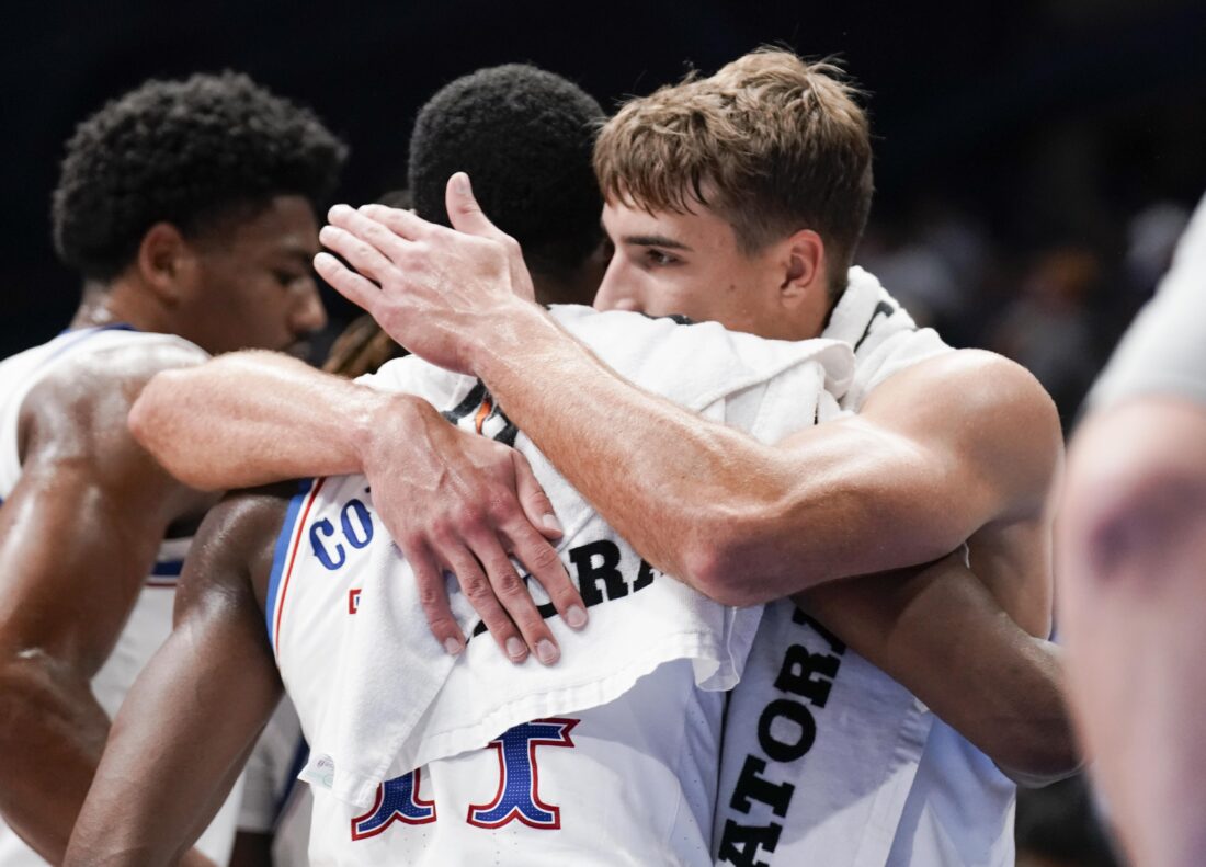 Kansas guard Kohl Rosario (7) gives a hug to Kansas guard Melvin Council Jr. (14) after a bucket during the second half of an exhibition game against Fort Hays State on Tuesday, Oct. 28, 2025 at Allen Fieldhouse. Photo by Nick Krug