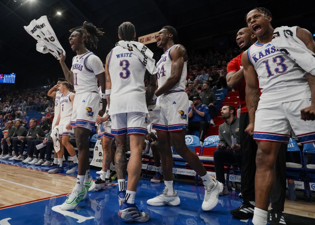 The Kansas bench celebrates after a bucket from Kansas guard Nginyu Ngala (0) during the second half of an exhibition game on Tuesday, Oct. 28, 2025 at Allen Fieldhouse. Photo by Nick Krug