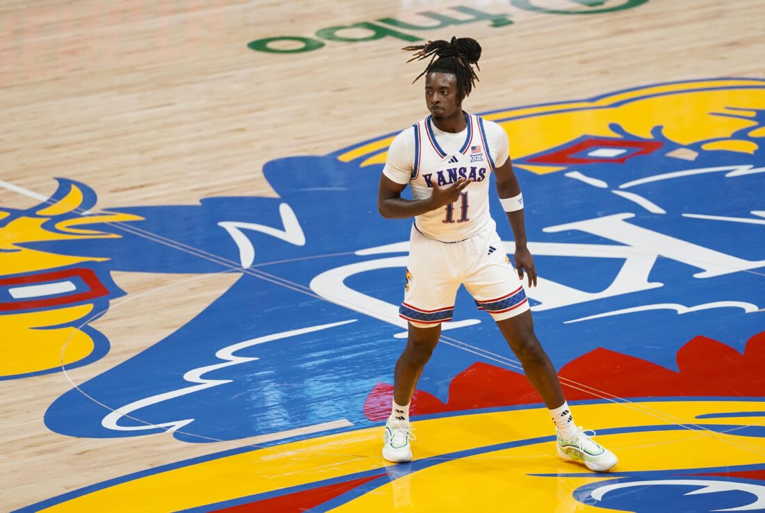 Kansas guard Jamari McDowell (11) celebrates after a three during the first half of an exhibition game on Tuesday, Oct. 28, 2025 at Allen Fieldhouse. Photo by Nick Krug
