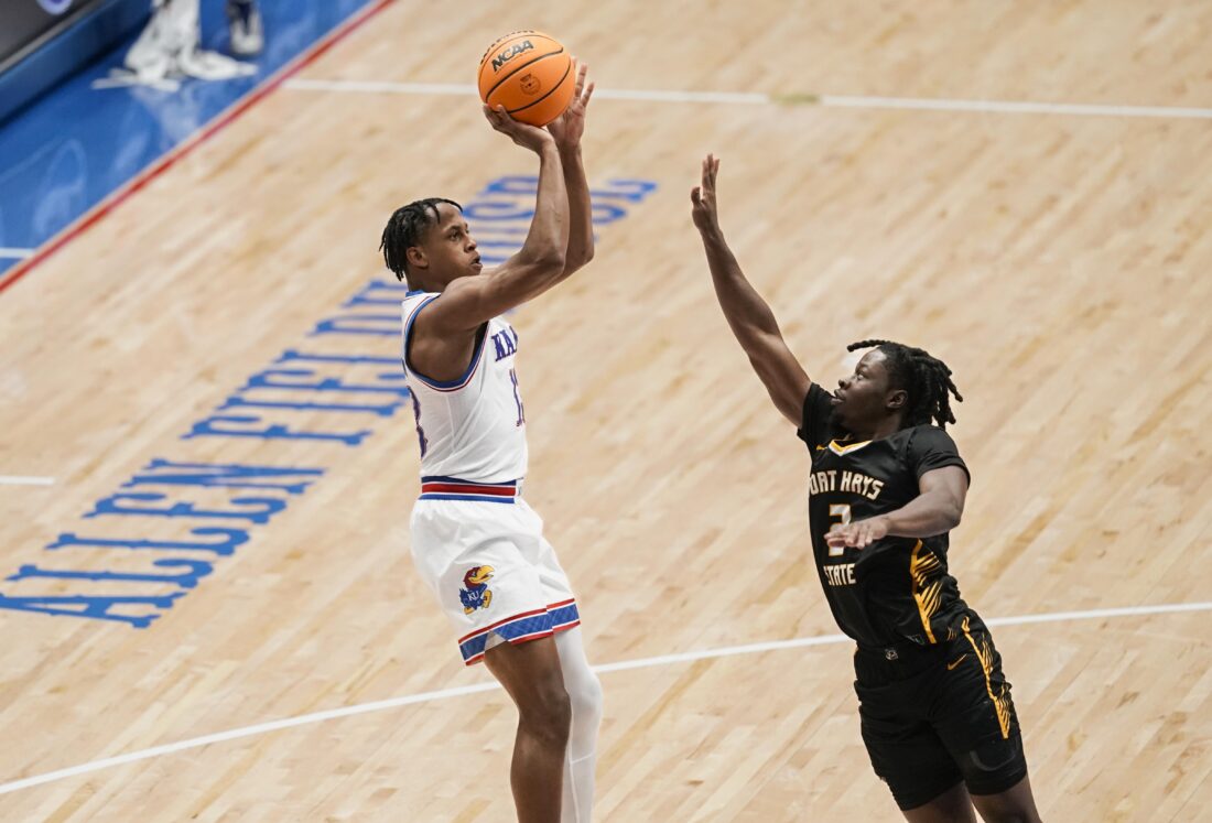 Kansas guard Elmarko Jackson (13) fades back for a shot over Fort Hays State guard Muhamed Kante (2) during the first half of an exhibition game on Tuesday, Oct. 28, 2025 at Allen Fieldhouse. Photo by Nick Krug