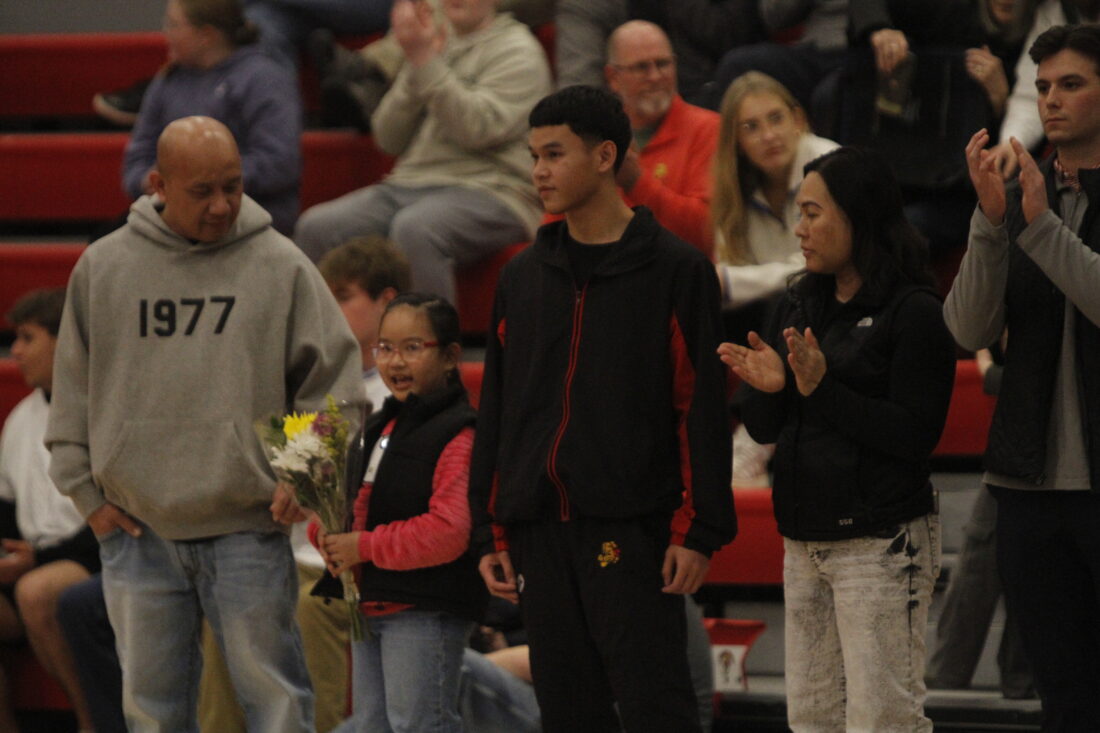 Lawrence’s Dominic Phommaseng stands with his family during senior night celebrations in the City Showdown wrestling dual at Lawrence on Jan. 21, 2026, in Lawrence.