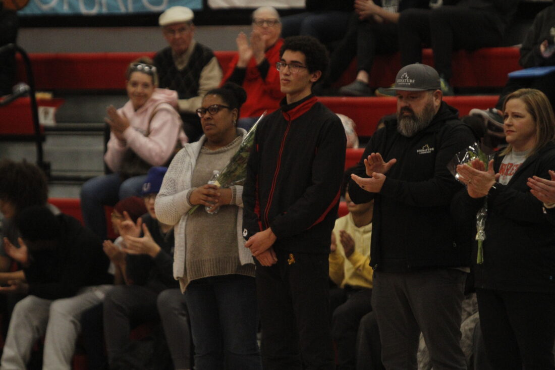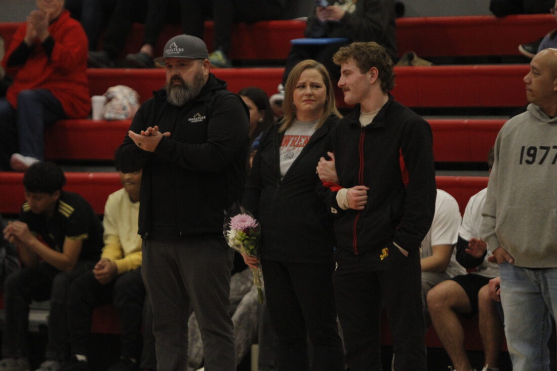 Lawrence’s Hunter Lown stands with his family during senior night celebrations in the City Showdown wrestling dual at Lawrence on Jan. 21, 2026, in Lawrence.