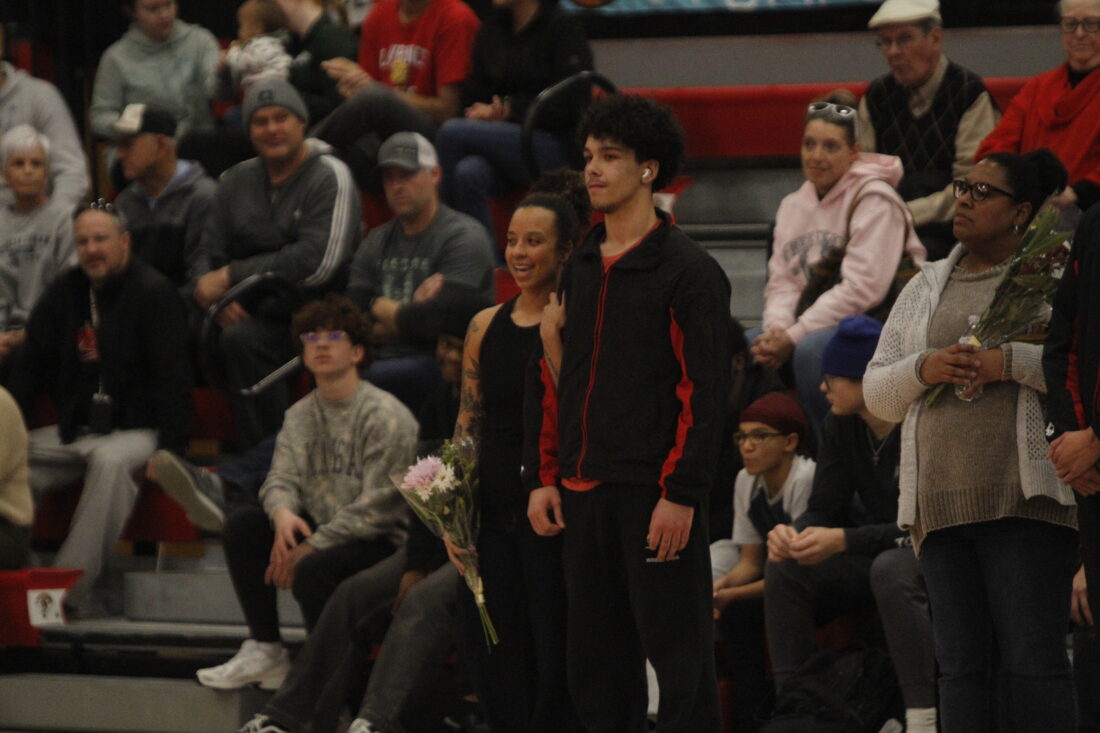 Lawrence’s Jadin Harrell and his mother stand during senior night celebrations in the City Showdown wrestling dual at Lawrence on Jan. 21, 2026, in Lawrence.