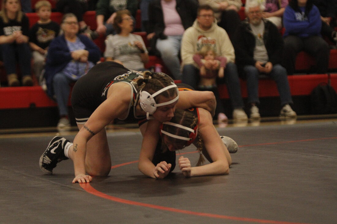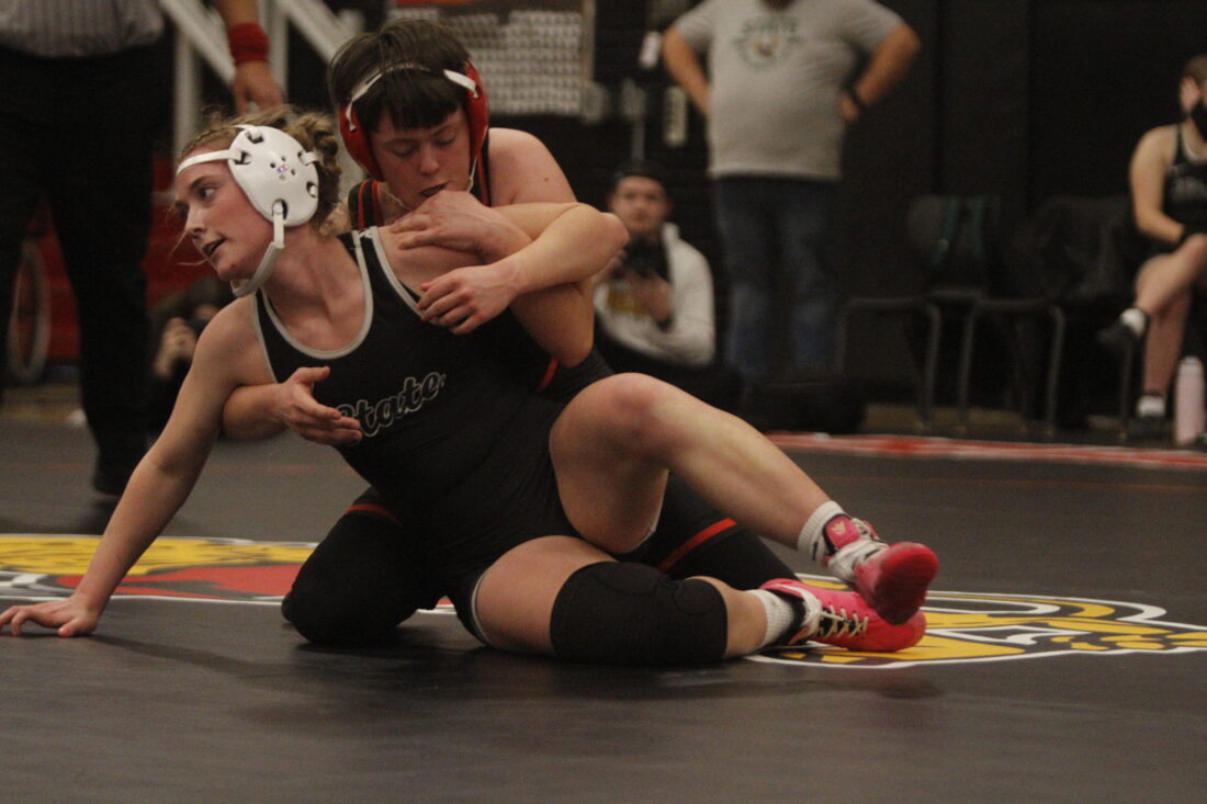 Free State’s Delaney Earl gets an arm around Lawrence’s Ivy Ford in the City Showdown wrestling dual at Lawrence on Jan. 21, 2026, in Lawrence.