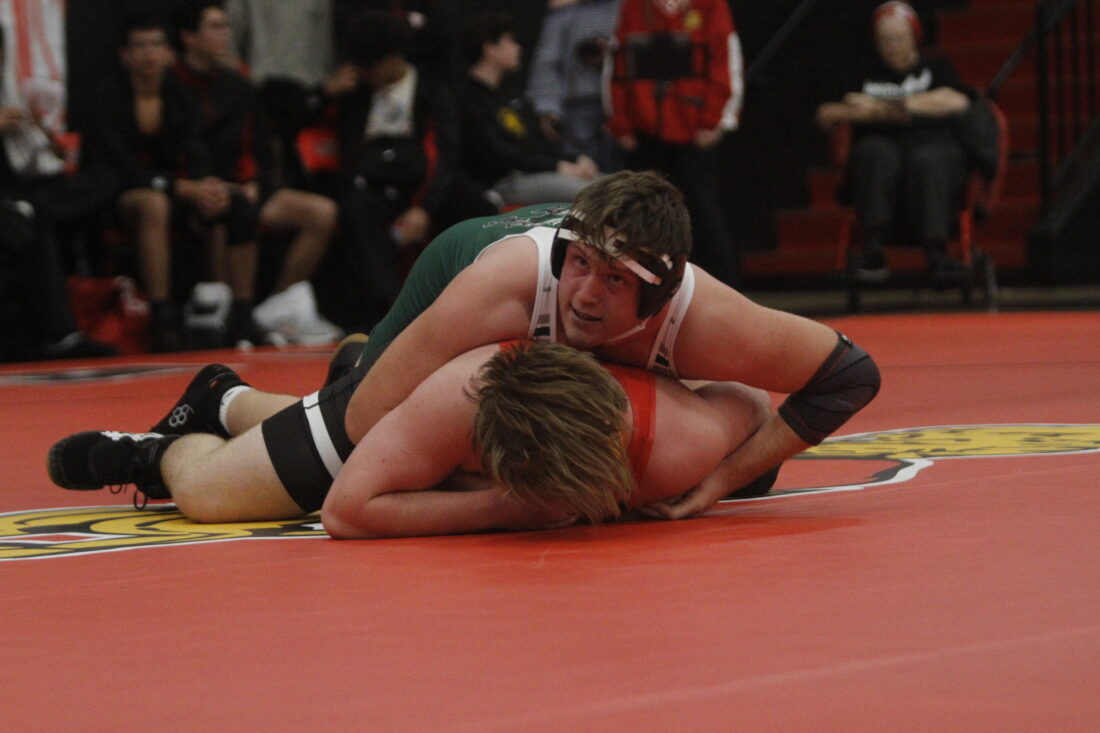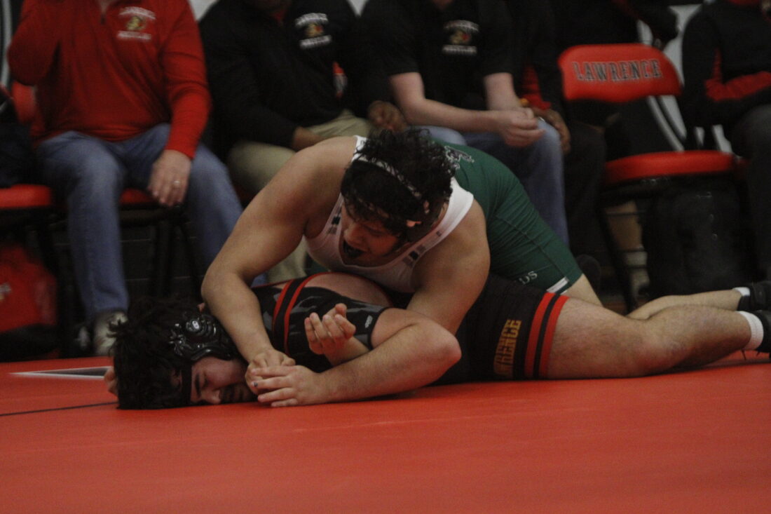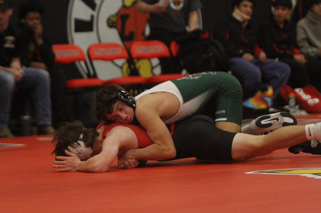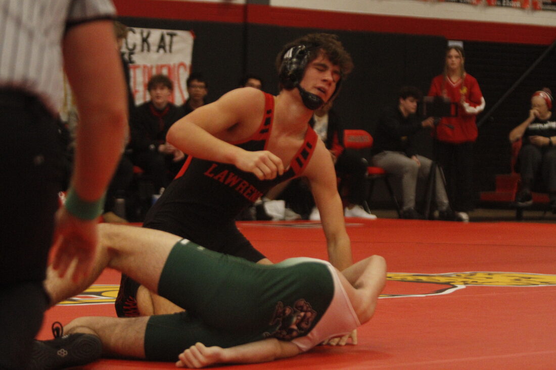 Lawrence’s Lou Elsten finishes a pin in the City Showdown wrestling dual at Lawrence on Jan. 21, 2026, in Lawrence.