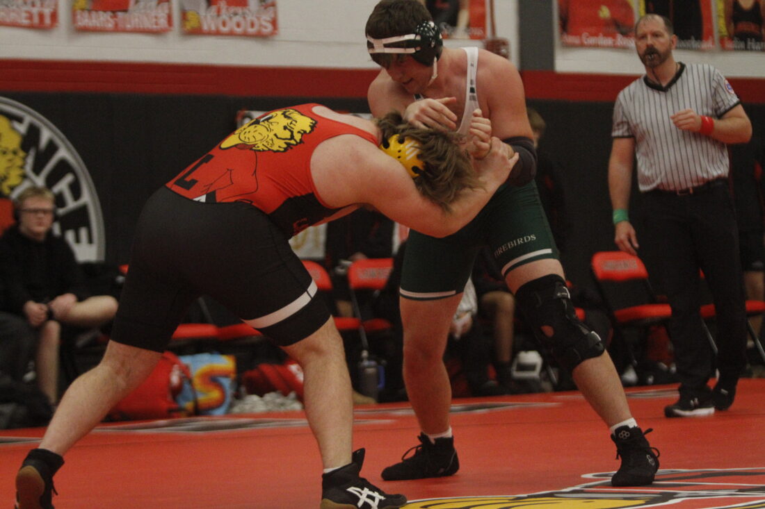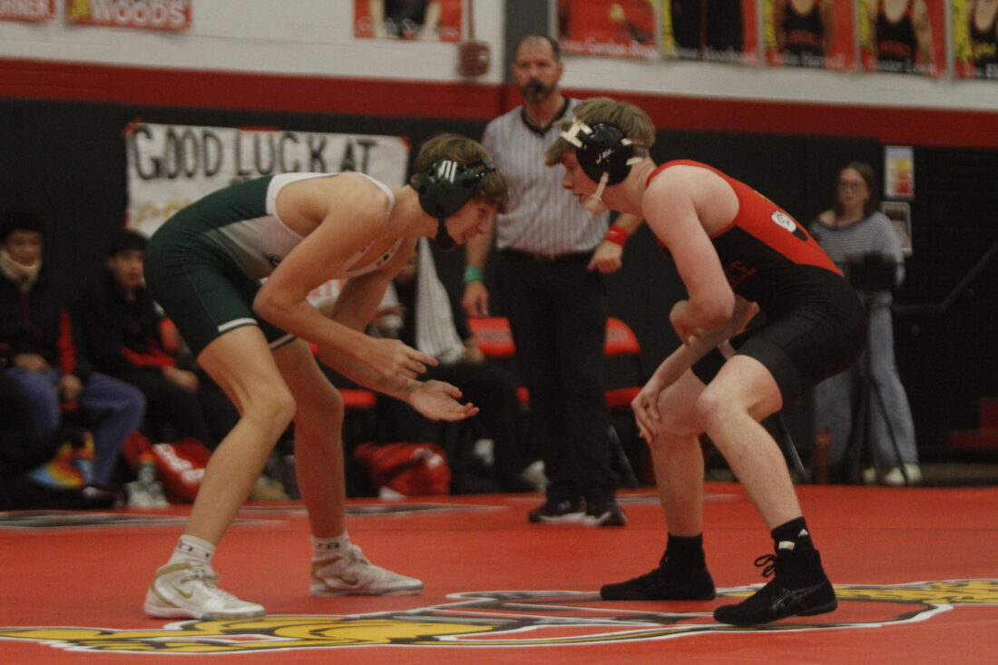 Free State’s Brogan Hagen, left, and Lawrence’s Blaine Schwada face each other in the City Showdown wrestling dual at Lawrence on Jan. 21, 2026, in Lawrence.