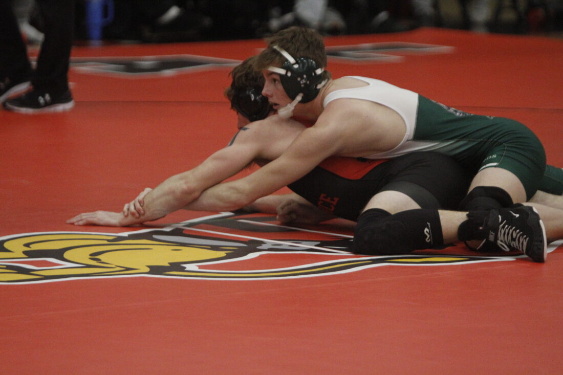 Lawrence’s Galen Dewhirst pushes Free State’s Damian Quick down in the City Showdown wrestling dual at Lawrence on Jan. 21, 2026, in Lawrence.