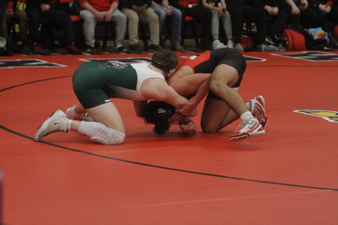 Free State’s Cesar Martinez puts his wrist on Lawrence’s Malachi Chrismon in the City Showdown wrestling dual at Lawrence on Jan. 21, 2026, in Lawrence.